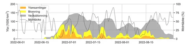 Det var först den 17 juni som de första mer utbredda förekomsterna med cyanobakterier kunde urskiljas på den satellitdata som SMHI använder. I år syntes de första mer utbredda förekomsterna, lite ovanligt, i norra Östersjön och inte som brukligt i sydost ned mot Polen och Litauen. Det kan delvis förklaras med att ytvattnet i juni ovanligt nog var varmare i norra än i södra halvan av Östersjön.