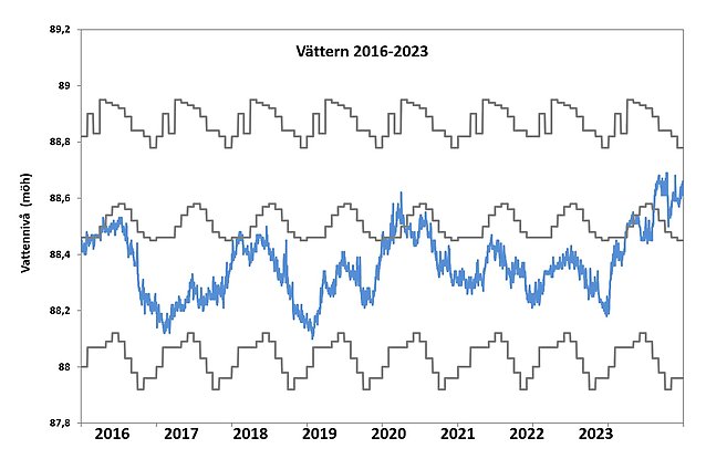 Den blå linjen visar vattenståndet i Vättern 2016–2023. De grå linjerna representerar de högsta och lägsta uppmätta månadsvärdena samt månadsmedelvärden för perioden 1959–2021. Alla nivåer anges i meter över havet i höjdsystemet RH00. Data har samlats in av Tekniska verken i Linköping