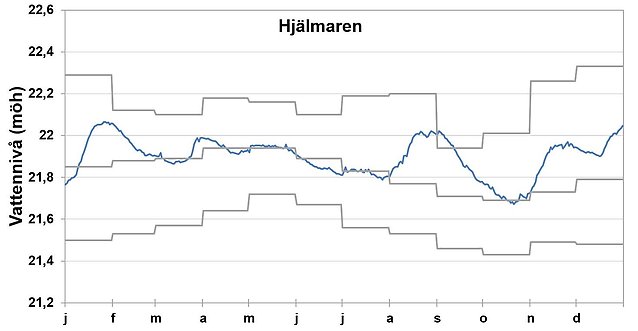 Den blå linjen visar vattenståndet i Hjälmaren 2023. De grå linjerna representerar de högsta och lägsta uppmätta månadsvärdena samt månadsmedelvärden för perioden 1988–2022. Alla nivåer anges i meter över havet i höjdsystemet RH00. Data har samlats in av Hjälmarens Vattenförbund.