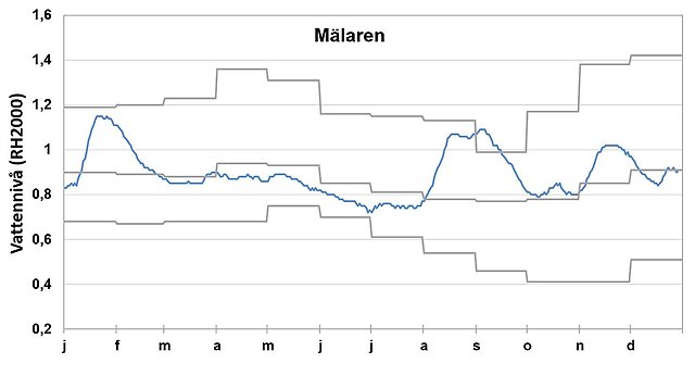 Den blå linjen visar vattenståndet i Mälaren 2023. De grå linjerna representerar de högsta och lägsta uppmätta månadsvärdena samt månadsmedelvärden för perioden 1968–2022. Alla nivåer anges i meter över havet i höjdsystemet RH2000. Data har samlats in av Stockholms Hamn AB.