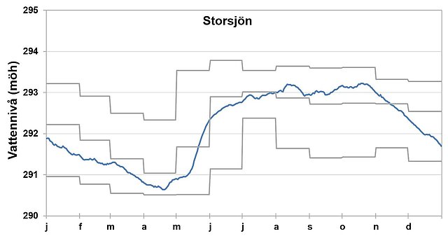 Storsjöns vattennivå sjönk årets fyra första månader som den normalt gör men på en nivå under det normala. Vårfloden fyllde på sjön i slutet på april och vattennivån var nära den normala fram till augusti. Den nederbördsrika hösten gav vattennivåer över de normala. Från oktober var vattennivån sjunkande och mycket under den normala i slutet på året.