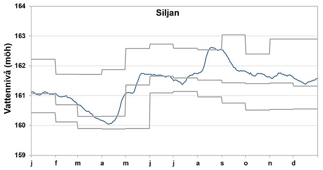 Vattennivån i Siljan var nära den normala under större delen av de första sex månaderna av året. I mitten på juli började vattennivån att öka och under augusti kom stora nederbördsmängder som gav kraftigt stigande vattennivå i Siljan. Den högsta vattennivån för månaden sedan 1964 uppmättes i mitten på augusti. Vattennivån var över den normala under resten av året men sjönk stadigt.
