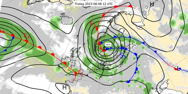 Väderläget under stormen Hans den 8 augusti kl 14 svensk tid.