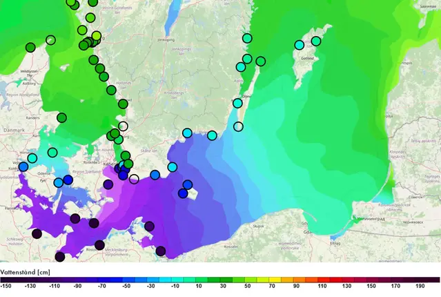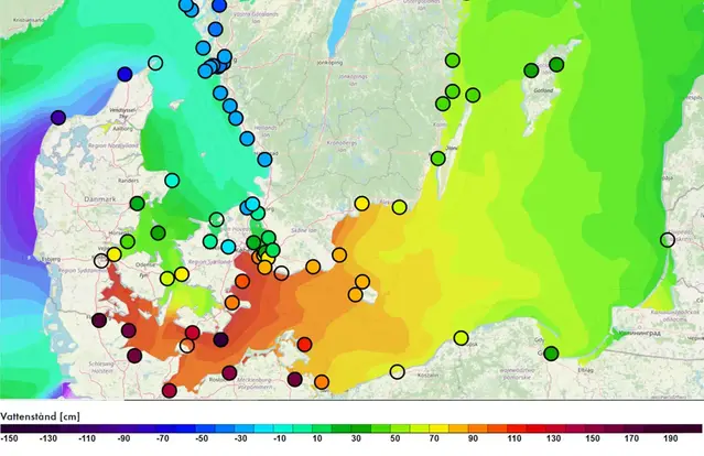 Modellerat vattenstånd för klockan 02 den 21 oktober 2023. Lägg märke till hur de grunda och smala passagerna i Öresund och Bälten effektivt blockerar vattnet i Östersjön från att strömma vidare. Illustration: SMHI