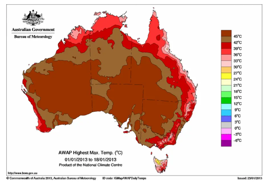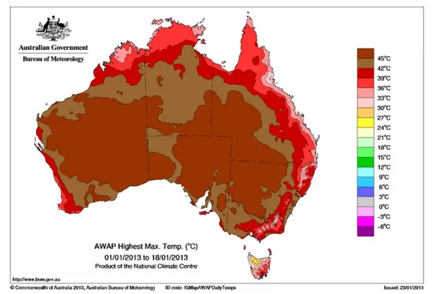 Australien noterade sin varmaste månad någonsin efter en värmebölja den 1-18 januari som påverkade större delen av landet. Värmerekord slogs i varje delstat och territorium. Framförallt den centrala delen av kontinenten drabbades av den extrema värmen. Många bränder rasade i flera delstater, bl a på Tasmanien och i New South Wales.