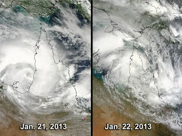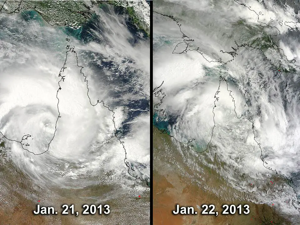 Förstora bildenDe två satellitbilderna visar hur den tropiska stormen Oswald försvagades över Kap Yorkhalvön i norra Queensland den 21-22 januari 2013.