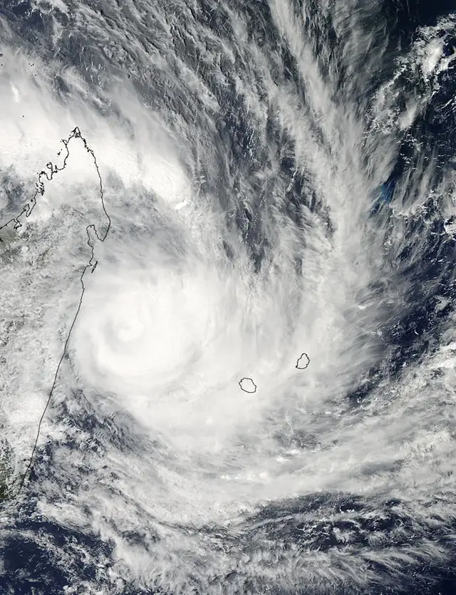 Förstora bildenSatellitbild från den 31 januari 2013 som visar den tropiska stormen Felleng mellan Madagaskar i väster och Réunion samt Mauritius i öster.