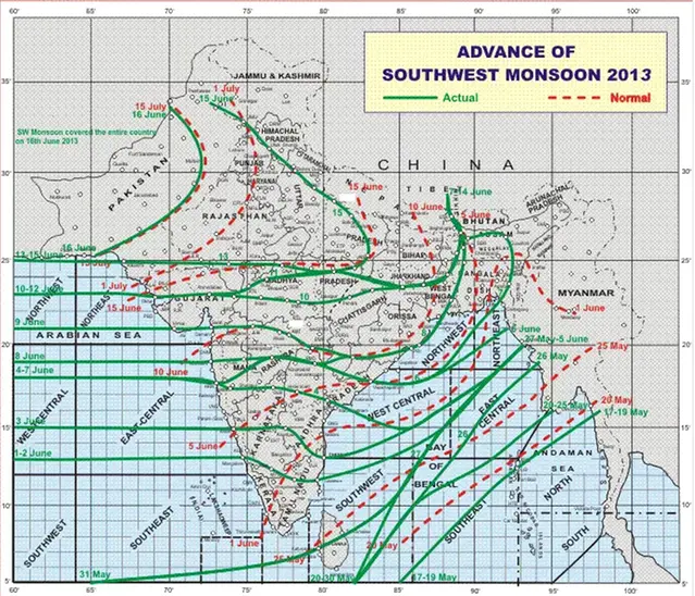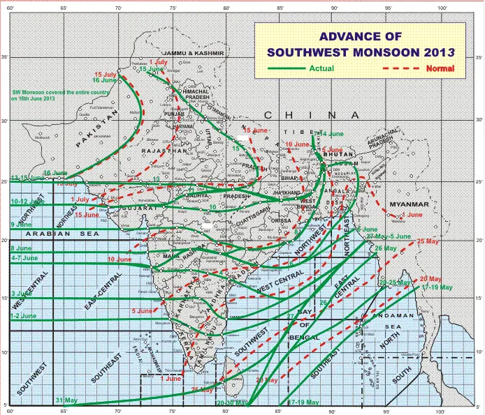 Förstora bildenSydvästmonsunens framryckning över Indien säsongen 2013.