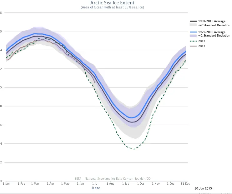 Förstora bildenIsutbredningen 2013 jämfört med 2012 och normalvärden. Diagrammet visar att isavsmältningen under juni 2013 inte skedde i samma snabba takt som 2012.