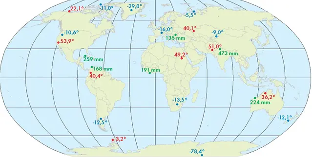 Förstora bildenHögsta och lägsta temperaturer samt största nederbördsmängder under 24 timmar i juni 2013.