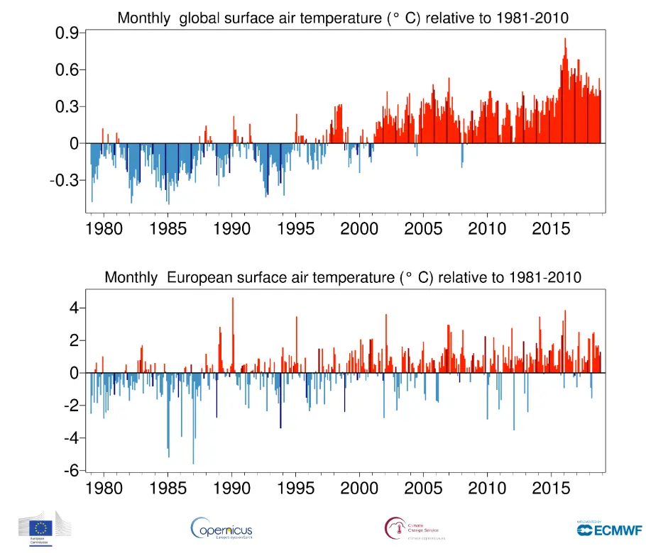Förstora bildenMånadsvis temperaturavvikelse globalt och i Europa från januari 1979 till november 2018 jämfört med medelvärdet för 1981-2010. De svarta staplarna visar avvikelsen för respektive novembermånad.