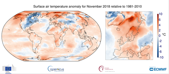 Enligt Copernicus Climate Change Service var november globalt sett den fjärde varmaste novembermånaden efter 2015-2017. Marginalen till 2017 på tredje plats var dock mycket liten.