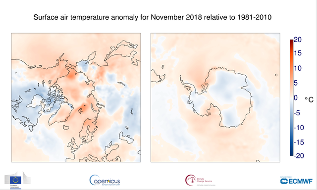 Förstora bildenTemperaturavvikelsen för Arktis (vänster bild) och Antarktis (höger bild) i november 2018 relativt perioden 1981-2010.