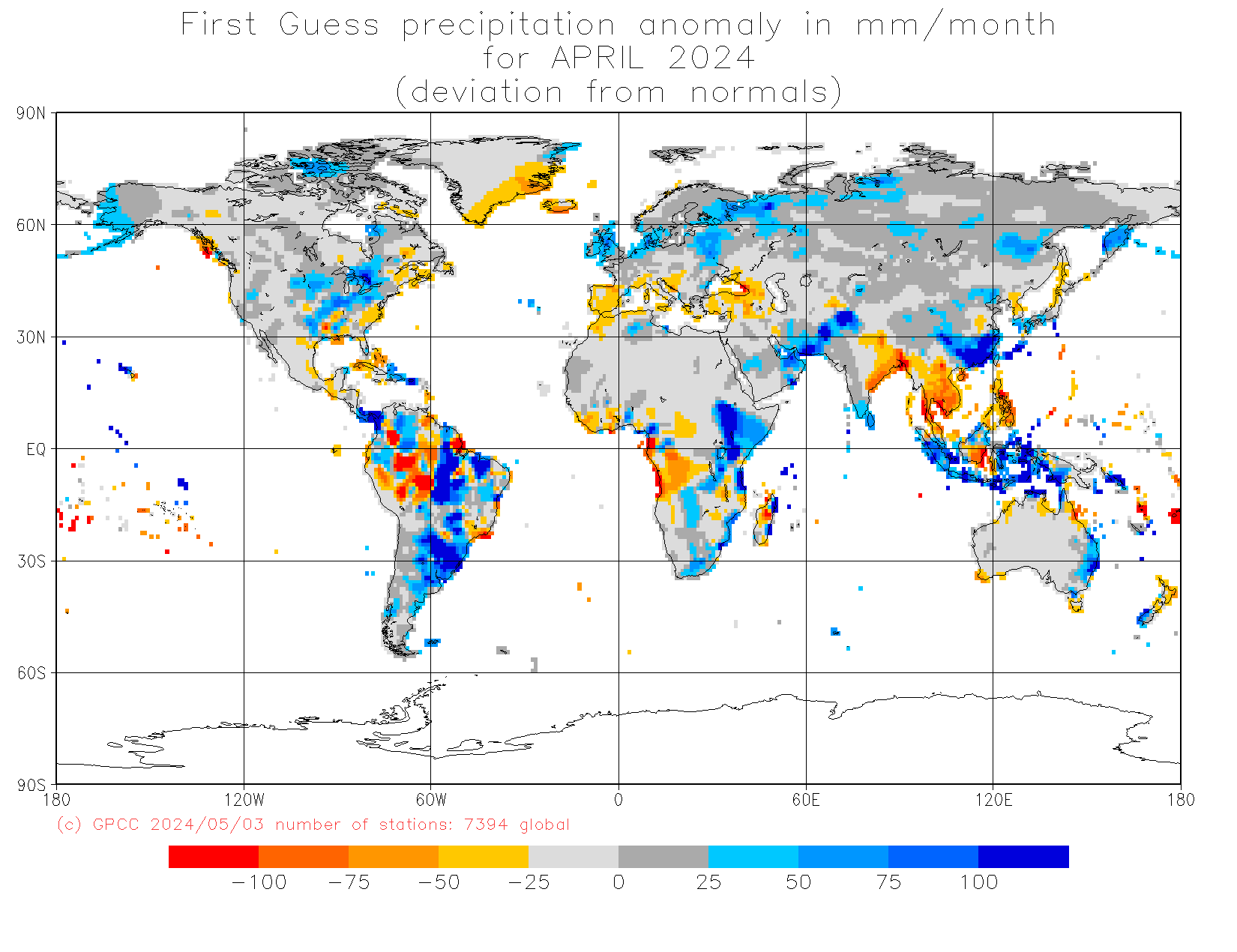 Förstora bildenPreliminär global nederbördsanomali i april 2024. Källa: DWD (GPCC).