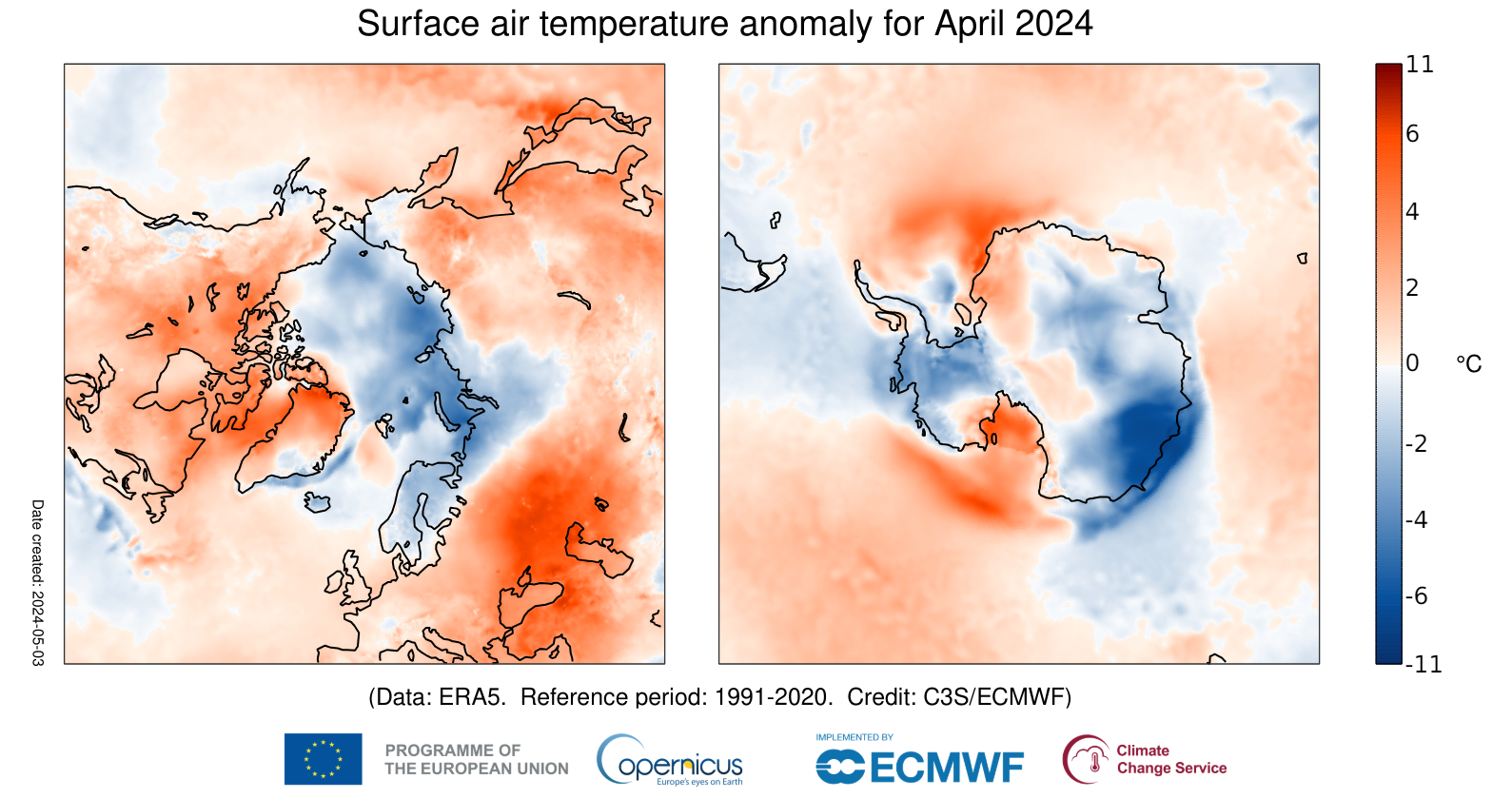 Temperaturavvikelse i april 2024 för Arktis (vänster bild) och Antarktis (höger bild) relativt normalperioden 1991-2020. Källa: ECMWF, Copernicus Climate Change Service.