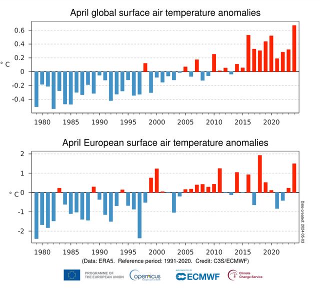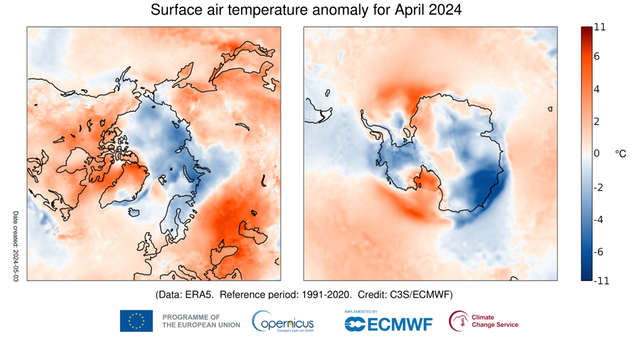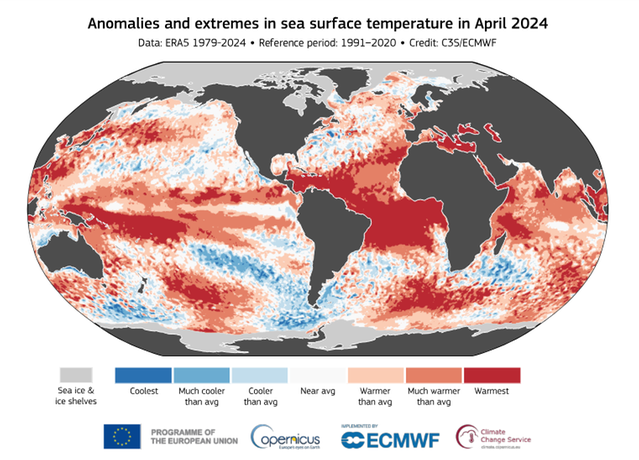 Den globala medeltemperaturen för april 2024 var den högsta som hittills uppmätts för en aprilmånad. Enligt Copernicus Climate Change Service var den 0,14° högre än den tidigare varmaste april 2016 och 0,67° högre än för normalperioden 1991-2020. Jämfört med den förindustriella perioden 1850-1900 var årets april 1,58° varmare.