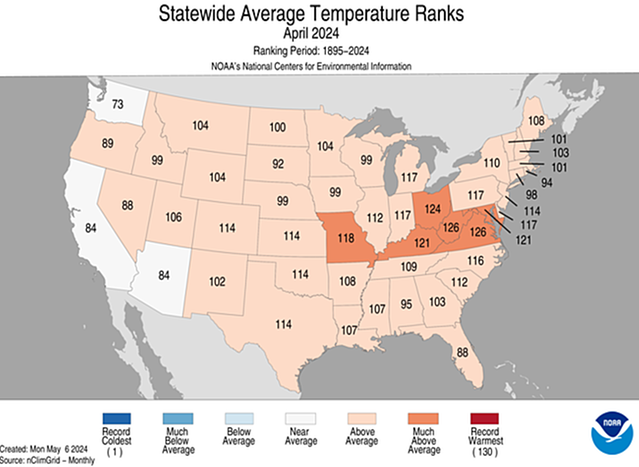Förstora bildenRanking av månadsmedeltemperaturen delstatsvis i USA i april 2024. 1 = kallast och 130 = varmast i en mätserie sedan 1895. Källa: Amerikanska vädertjänsten (NOAA).