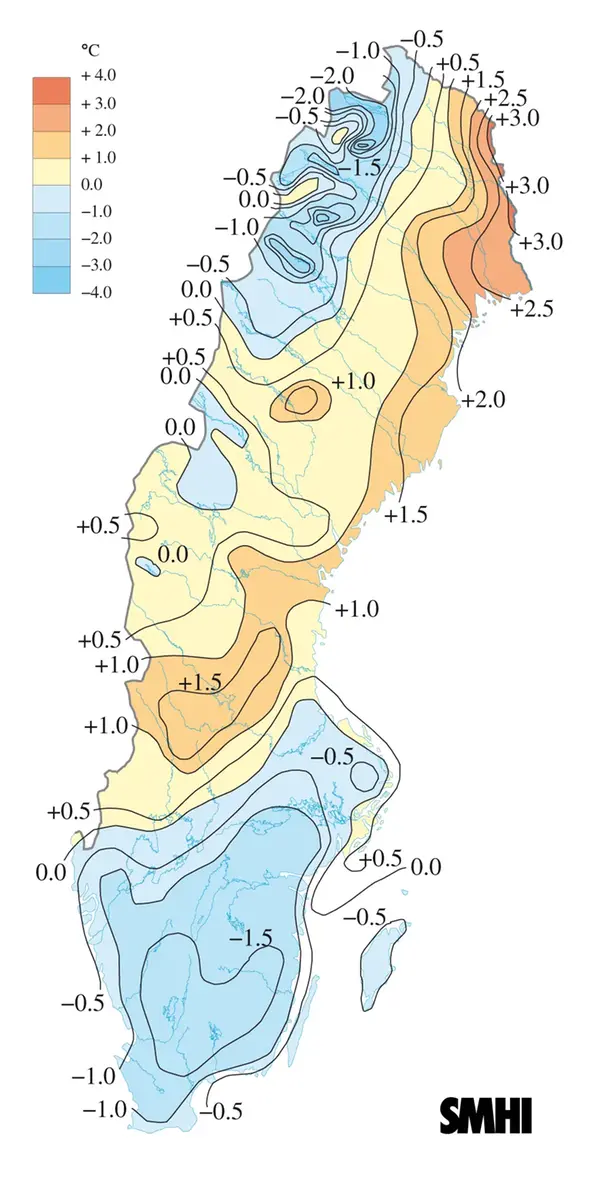 I inre Götaland och i låglänt terräng i västra Lappland var det drygt 1° kallare än normalt, medan främst östra Norrland hade drygt 1° varmare än normalt.