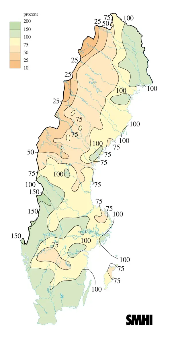 Allra minst föll i fjälltrakterna där Ritsem vid Stora Sjöfallets nationalpark bara fick ihop 5 mm. De avslutande två dygnens kraftiga nederbörd i sydvästra Sverige förde upp den sammanlagda mängden till drygt 100 mm i inre Halland.