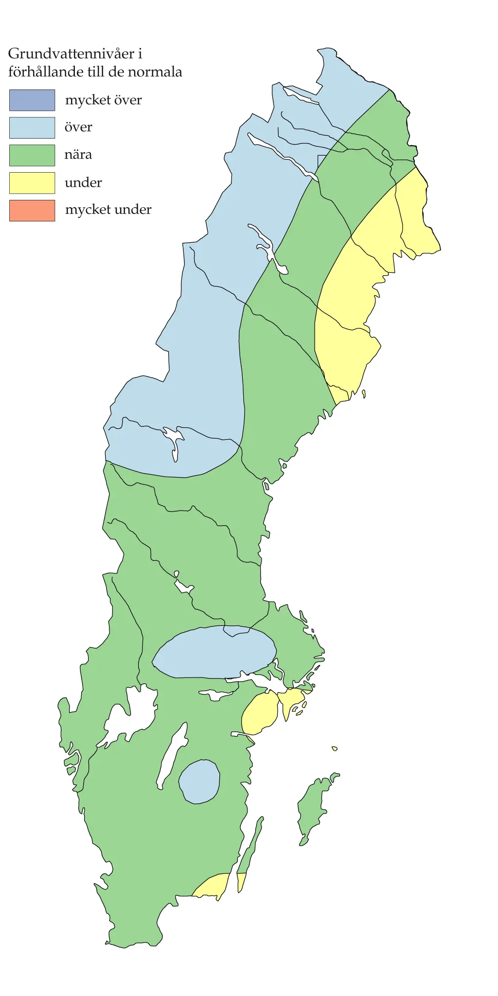 I västra Norrland och i ett område i mellersta Svealand var grundvattennivåerna över de normala. I Norrlands nordöstra hörn och i östra Södermanland var nivåerna något under de normala.