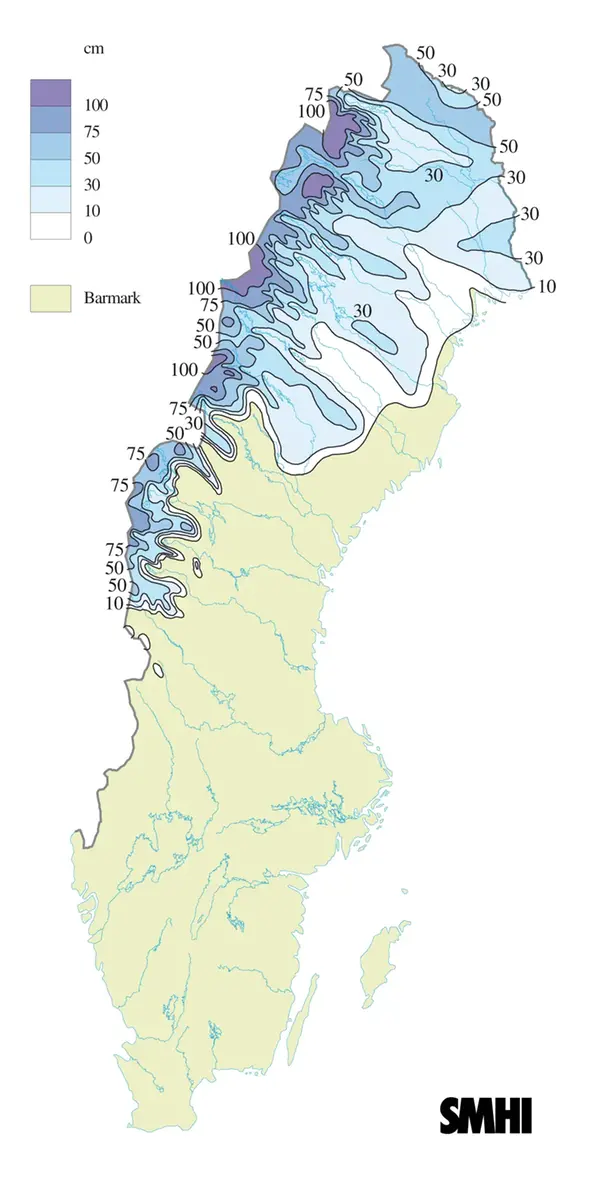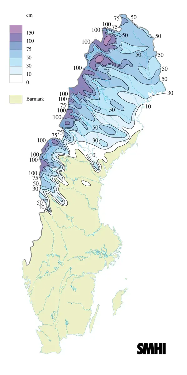 Sol och värme under april hade reducerat snötäcket betydligt, men Katterjåkk kunde dock fortfarande ståta med hela 100 cm på månadens sista dag.