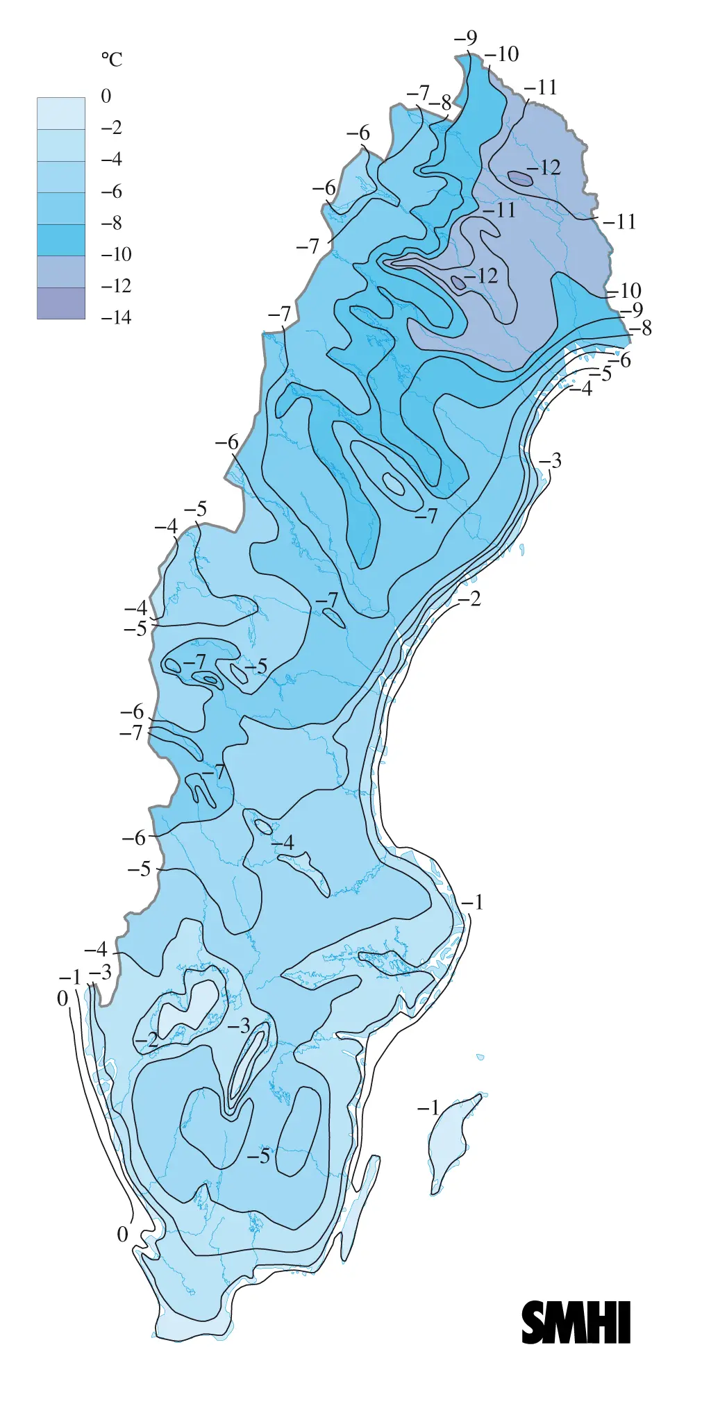 Trots ett par perioder med nästan extrem kyla i dalgångar i Norrlands inland blev det till slut just där störst överskott med 5-6°. På de flesta håll var det dock mildare i fjol.