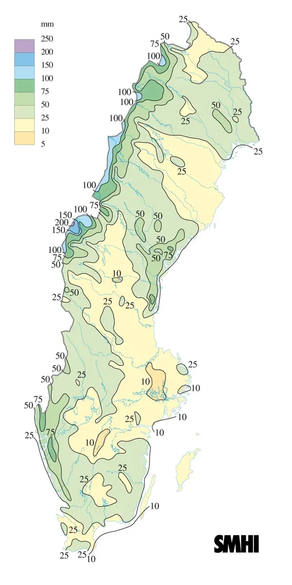De tre sista dygnen kom det mycket regn och snö i västligaste Jämtland där Digernäset vid Kallsjön fick ihop månadsmängden 159 mm. Annars dominerade områden med underskott kraftigt och på Ölands södra udde tangerades bottenrekordet på 3 mm.