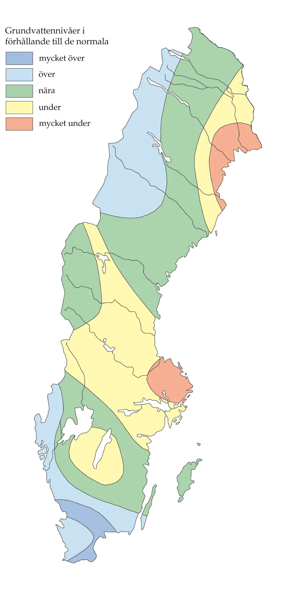 I stora delar av landet var nivåerna normala eller över de normala för årstiden. I de inre delarna av Götaland, stora delar av Svealand och södra Norrland samt i de östra delarna av Norrbottens län var nivåerna dock under eller mycket under de normala.