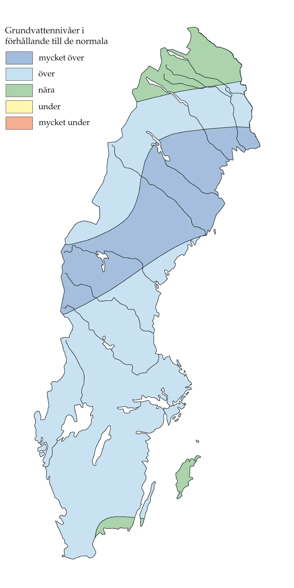 I praktiskt taget hela landet var nivåerna över eller mycket över de normala för årstiden. I Blekinge, på Gotland och i den norra delen av Norrbottens län var de normala.