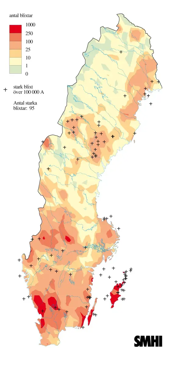 Antalet urladdningar avser en yte inom 15 km radie, dvs 707 km2.