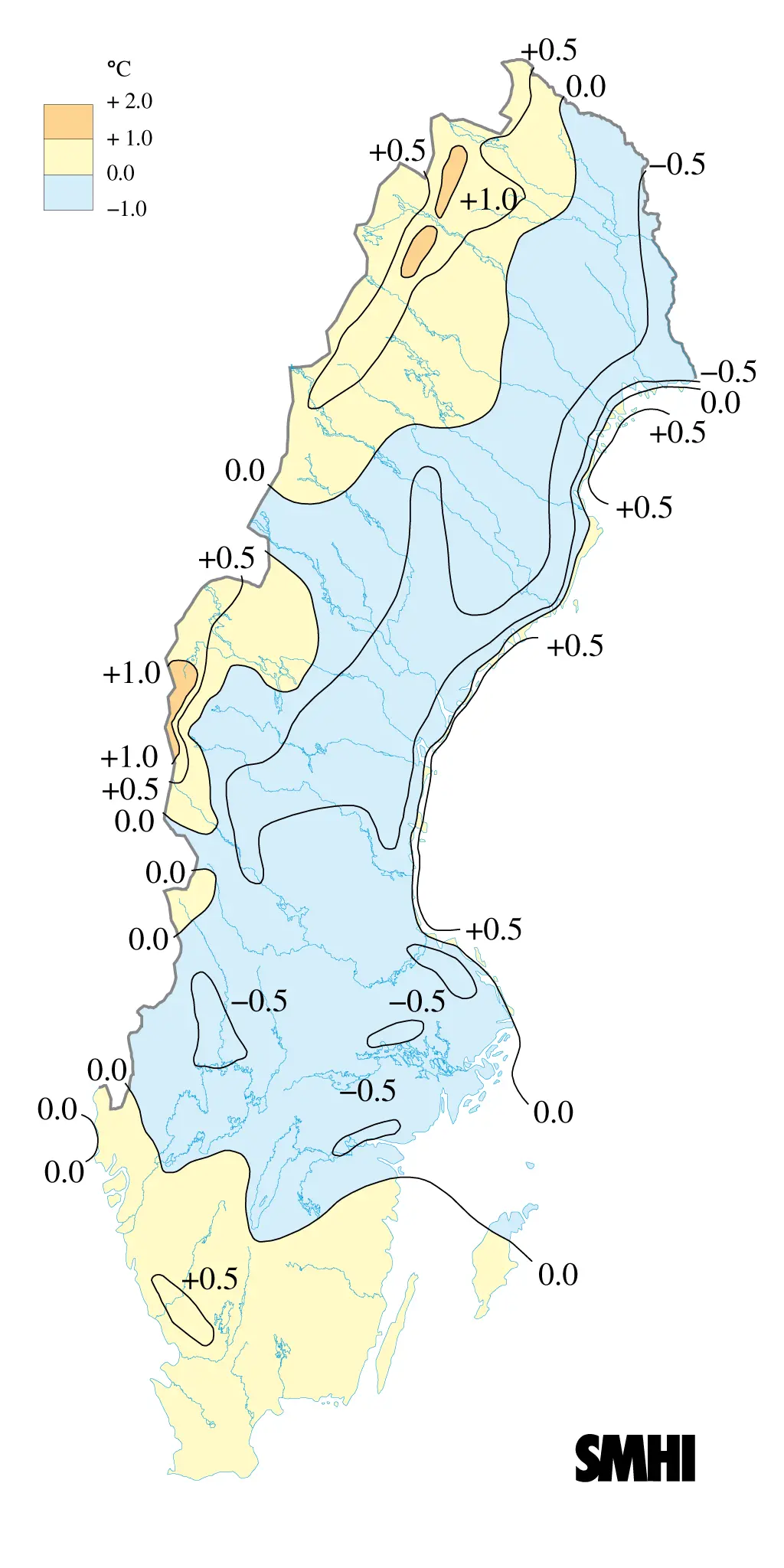 Undantag är förutom förra året, då det var små underskott i norr, även september 2000, då det var kyligt framför allt i södra Sverige. Extremt mild var månaden åren 2006 och 1999.