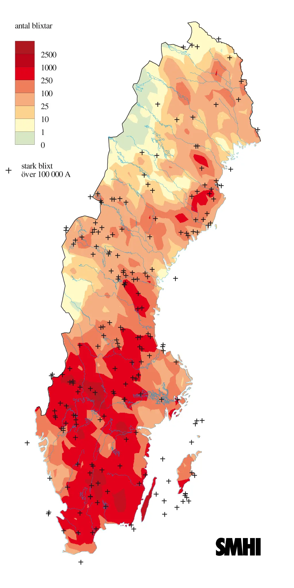 Antalet urladdningar avser en yte inom 15 km radie, dvs 707 km2.