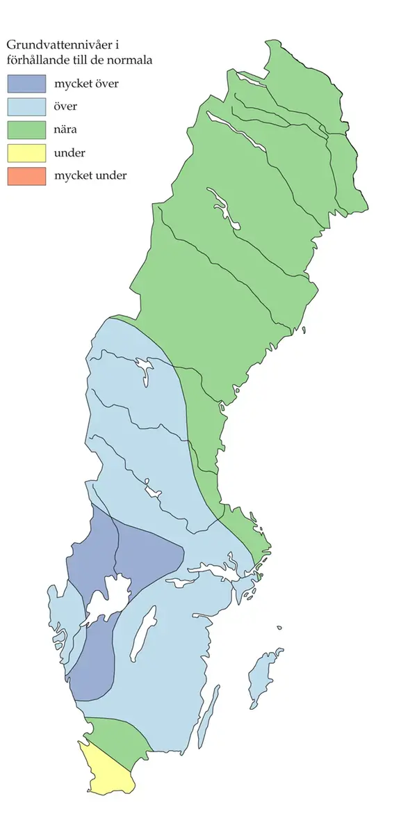 Grundvattennivåerna har sedan augusti sjunkit och stigit i varierande omfattning i olika delar av landet. I Götaland har nivåerna vanligtvis stigit med ungefär 10 cm. Förändringarna var i stort sett normala för årstiden.
