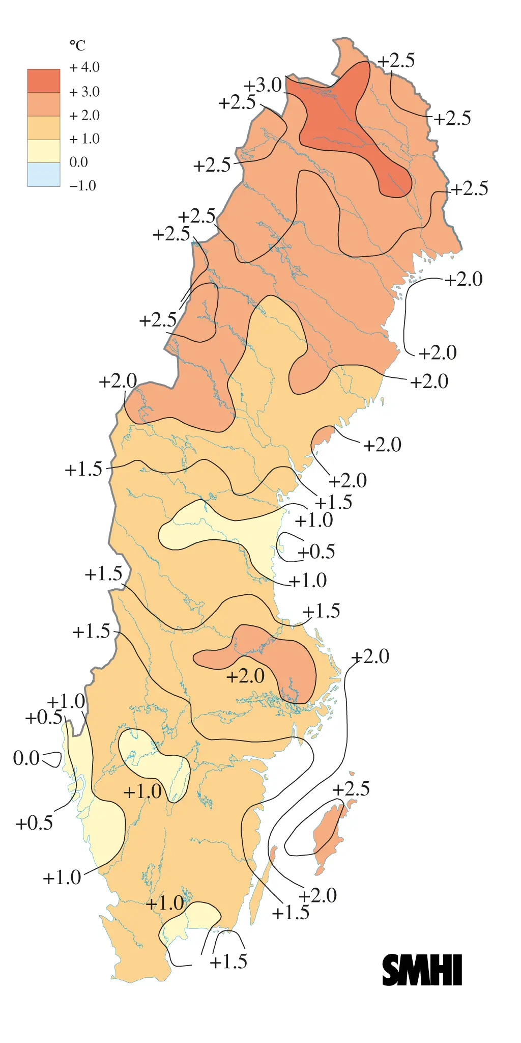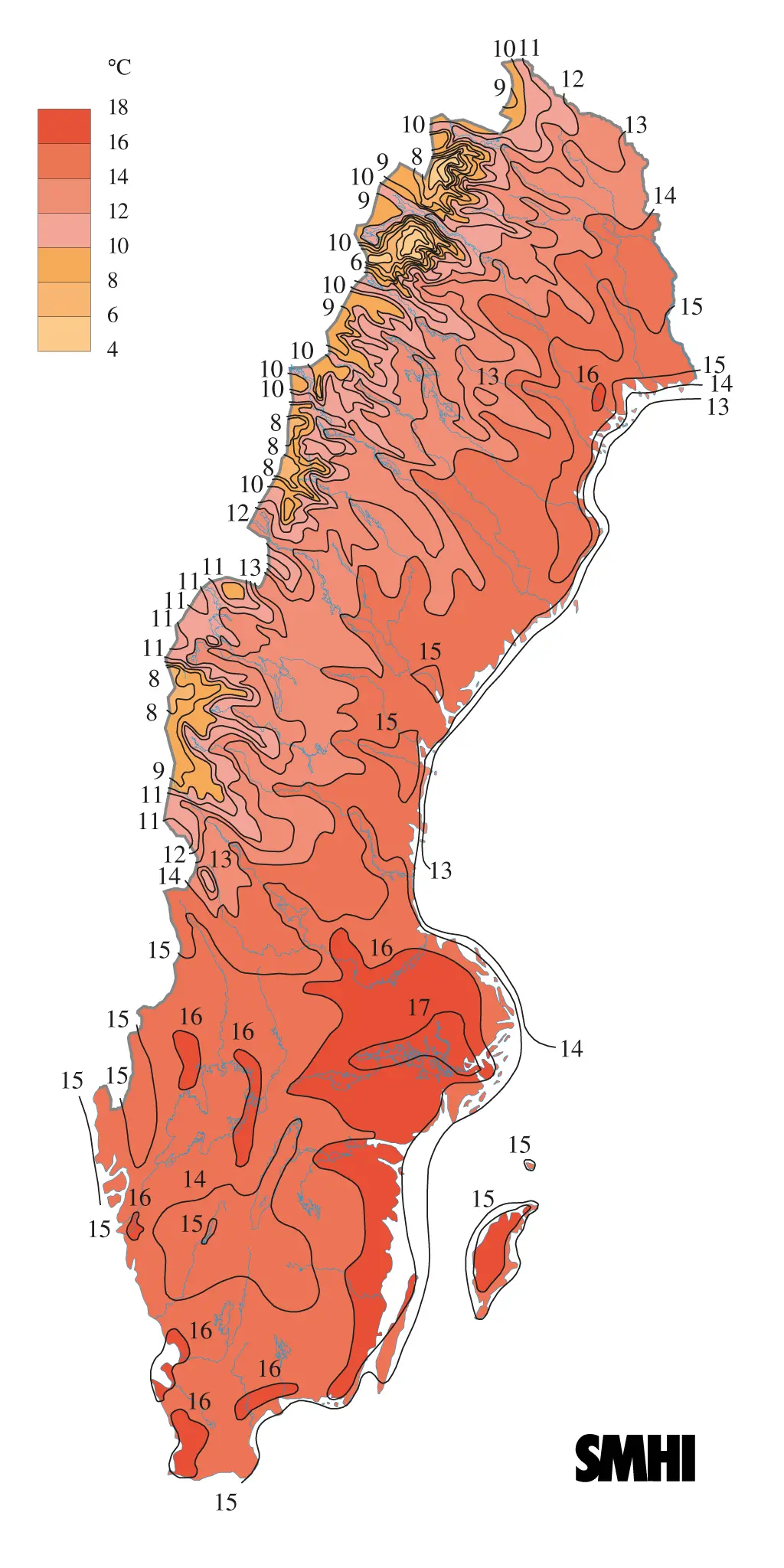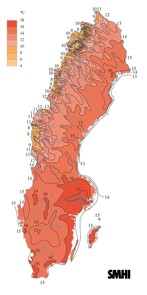 Svealand | +29.9° den 7 Risinge, den 9 Sala A (Uppland) och den 11 Eklången (Södermanland) |