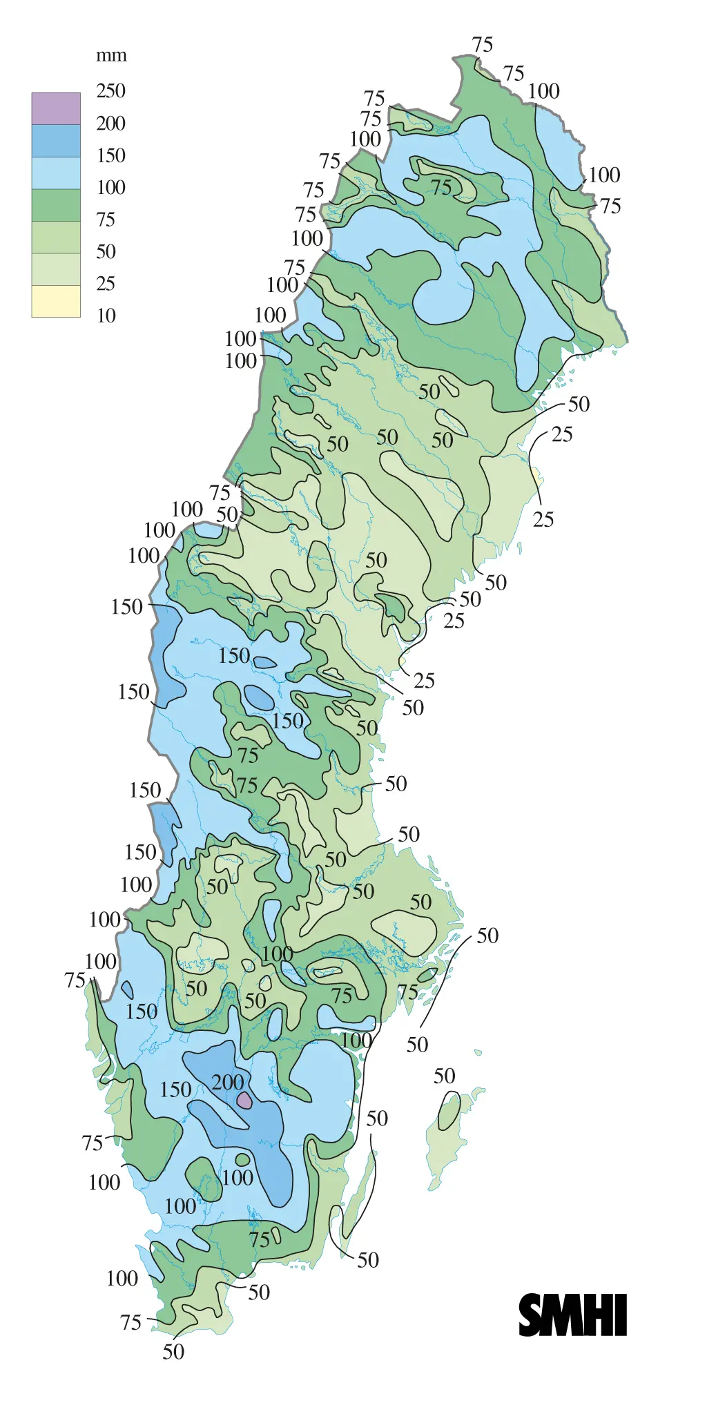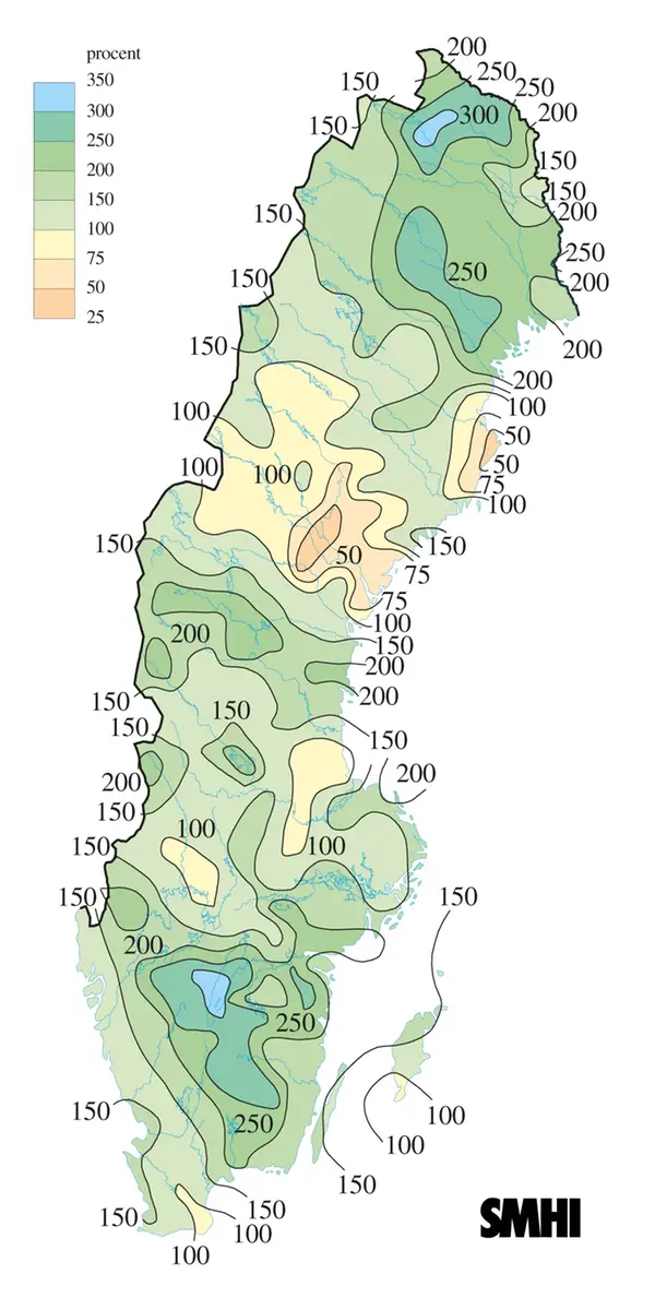 Ett område kring södra Vättern fick allmänt över 150 mm och på Visingsö med 170 mm blev det den blötaste juni där sedan startåret 1938. Det förra rekordet där, 167 mm, inföll så sent som 2007.