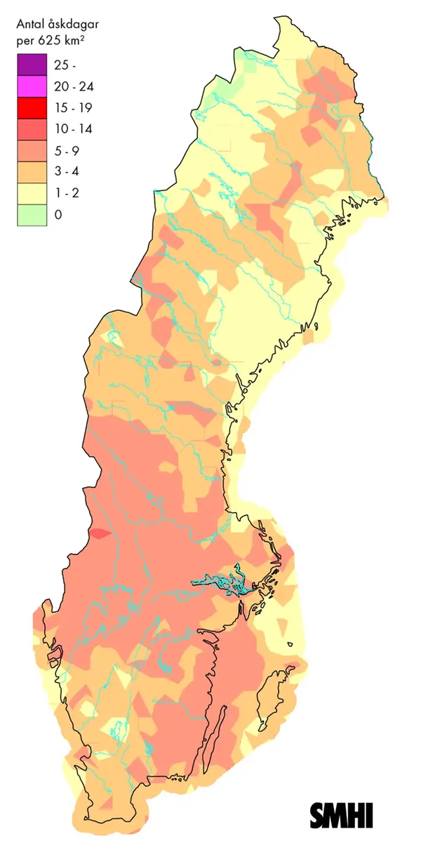Kartan med åskdagar visar det antal dygn då systemet registrerat minst en urladdning inom en kvadrat med sidan 25 km (ytan 625 km²). Då blir avståndet från kvadratens mittpunkt till dess gräns i närheten av det största avstånd inom vilket åskan normalt kan höras (ca 15 km).