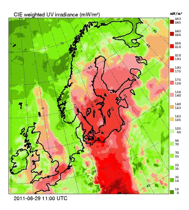 Förstora bildenUV-strålningens styrka kl 11 UTC (13 sommartid) den 29 juni 2011.