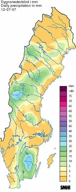 Andra regnområden drog in söderifrån över Götaland. Baramossa i Halland fick 54 mm och Hoburg på Gotland 63 mm den 14. Den 15 hade nederbörden med regn- och åskskurar sitt centrum över Svealand och östra Norrland. Norrby i Uppland fick då 43 mm.