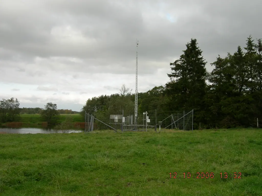 Förstora bildenAutomatstationen i Hällum i Västergötland. Där noterades den 28 juli svenskt byvindsrekord (fjällstationer undantagna) för juli månad med 35 m/s i samband med en tromb. På den här bilden från år 2006 flyter dock Lidan stilla i bakgrunden.