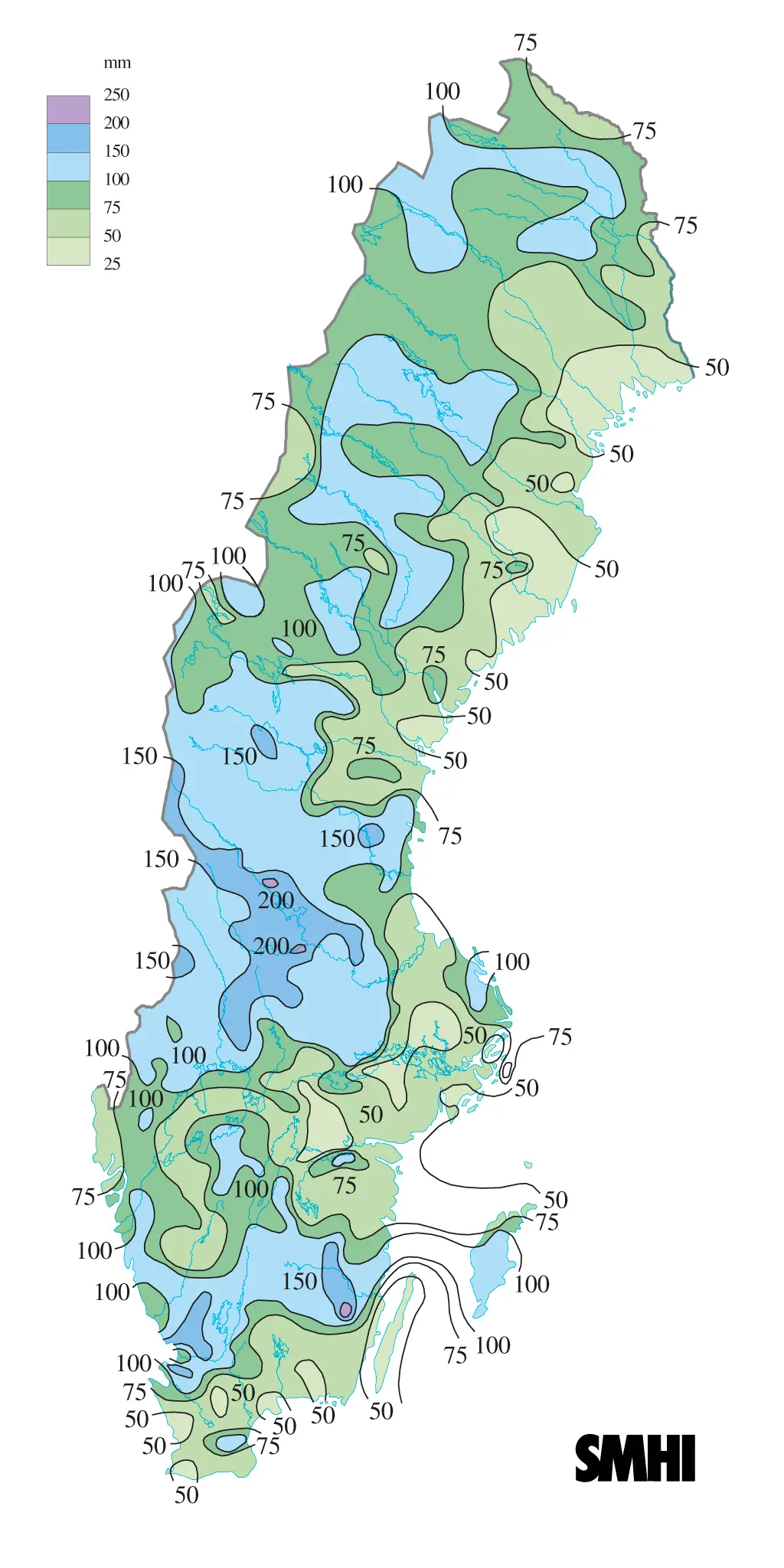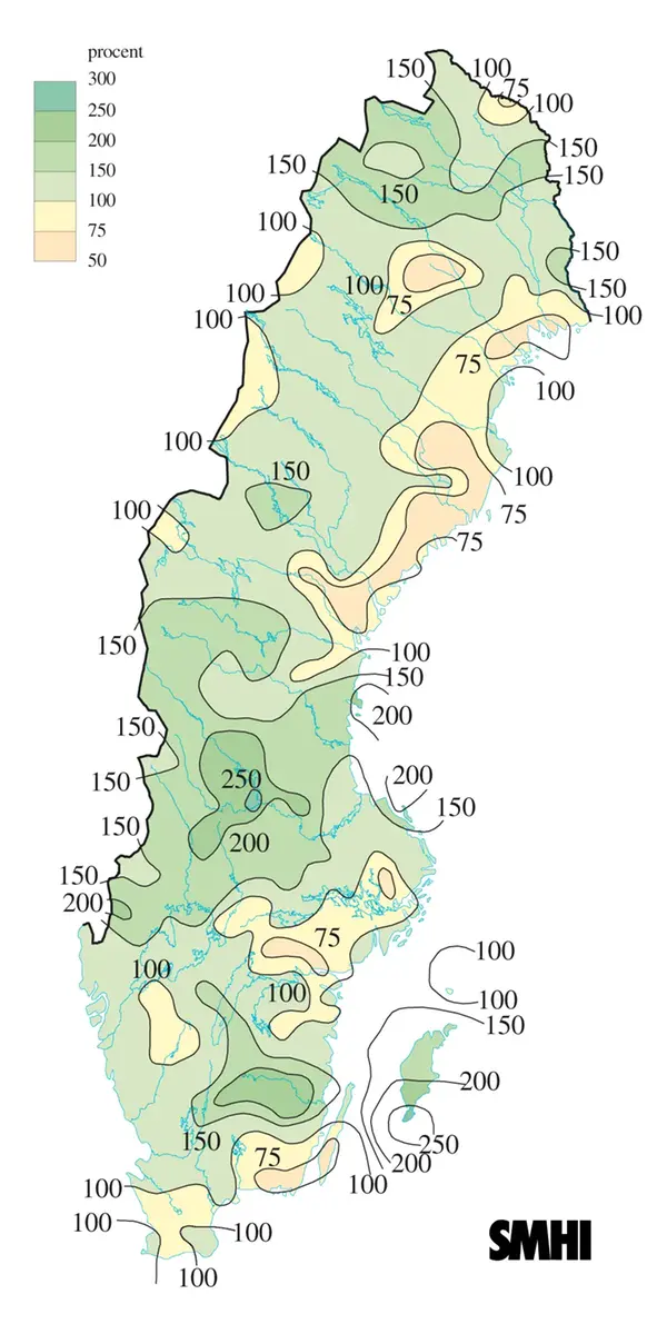 I norra Norrland var det samtidigt några dygn med rätt soligt väder medan det lokalt förekom regnmängder på drygt 40 mm i Götaland och Svealand även den 9.