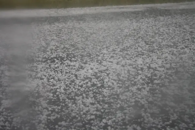 Förstora bildenI samband med kraftiga hagelbyar kan det kortvarigt se ut som om marken vore täckt av nysnö .