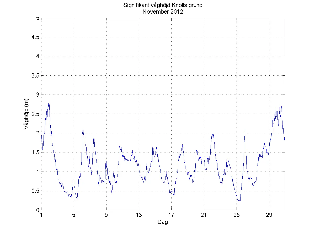 Bojen vid Knollsgrund registrerade vågor över 2,5 meter vid två tillfällen. Den 1 var det en sydostlig vind på över 10 m/s varvid signifikanta våghöjden steg till 2,8 m. Den 30 var det en nordlig vind av kulingstyrka och signifikanta våghöjden steg till 2,7 m.