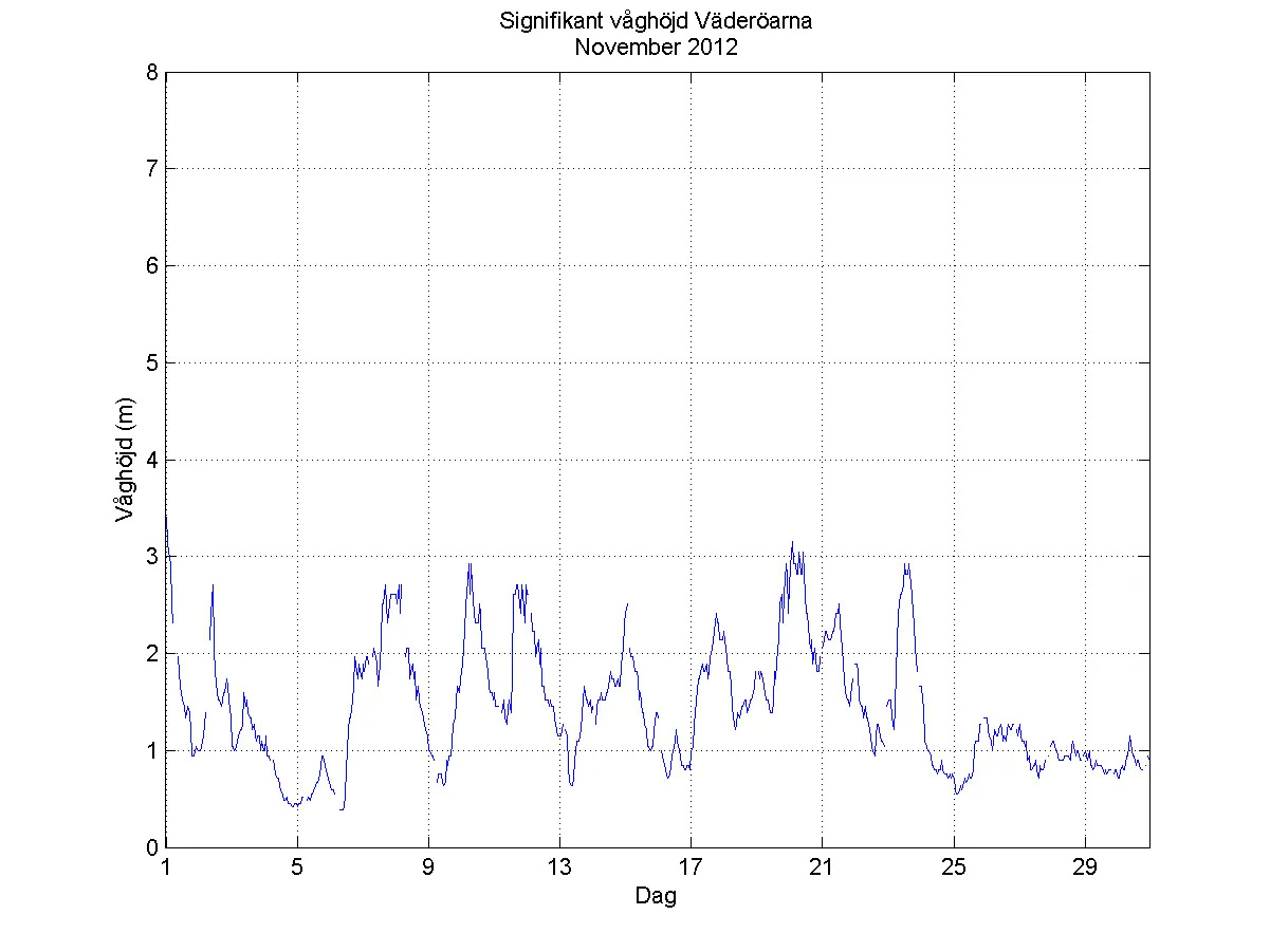 Vid Väderöarna steg den signifikanta våghöjden över 3 meter vid 2 tillfällen. Den 1 var det en sydlig vind längs västkusten av kulingstyrka och den signifikanta våghöjden* steg då till 3,4 meter. Den 20 var det återigen en sydlig vind denna gång på ca 10 m/s och den signifikanta våghöjden steg till 3,2 m.