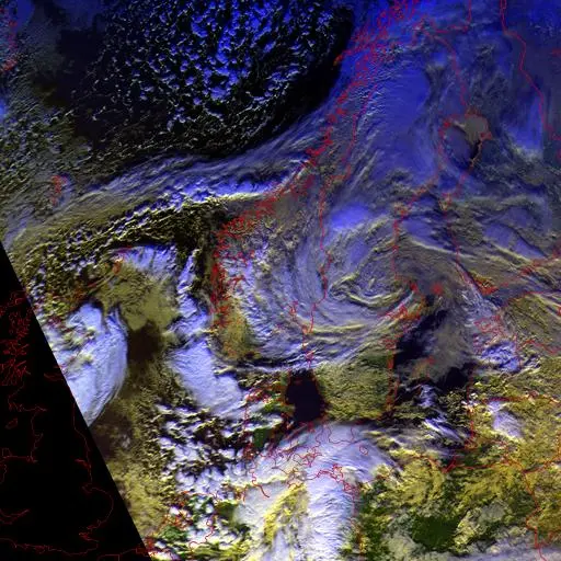 Förstora bildenSatellitbild över Norden 5 februari 2013. Över Svealand syns molnvirveln som utgör centrumet för lågtrycket som sakta försköts söderut.