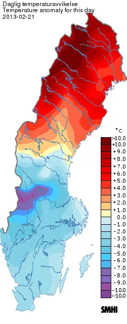 Förstora bildenDygnsmedeltemperaturens avvikelse från den normala, 21 februari 2013.
