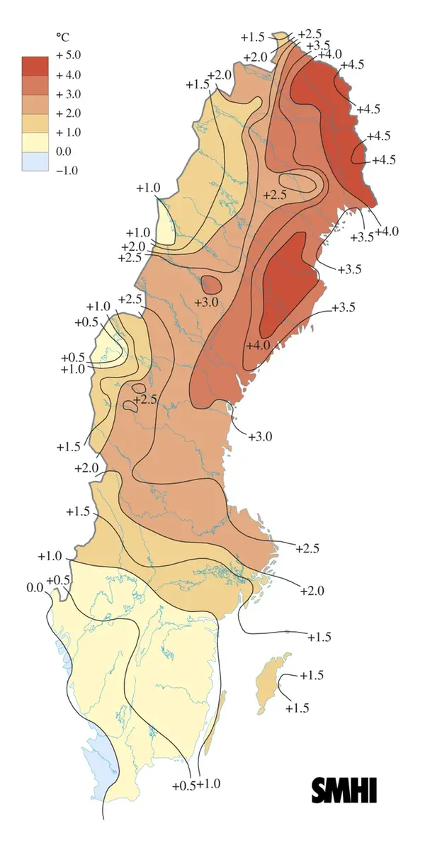 Månaden var som helhet varmare än normalt. Varmast var det i nordöstra Norrland, med upp till 5 graders temperaturöverskott. Undantaget var delar av västra Götaland som hade någon enstaka grad kallare än normalt. Vi får gå tillbaka ända till den extremt varma februarimånaden 2008 för att hitta en som var varmare.
