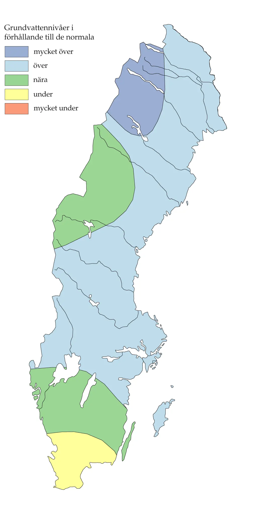 I större delen av landet var grundvattennivåerna för årstiden över eller nära de normala. Nordvästra Norrland hade nivåer mycket över de normala. I södra Götaland var nivåerna under de normala.