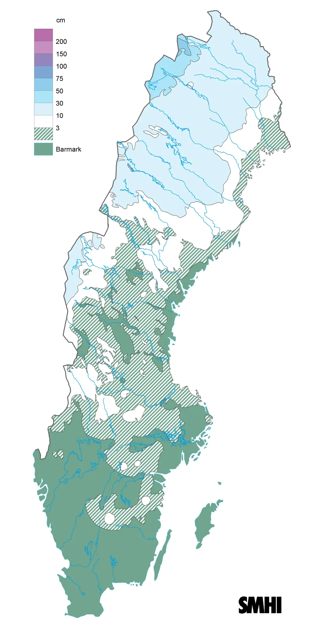 Vid månadens början låg snö i stora delar av Norrlandsfjällen och även ut över norra Norrlands kust- och inland. Snön smälte sakta bort från kustlandet under månadens första dagar men fylldes på längre västerut. Mellan den 11-15 lade sig snö lokalt även i norra Götaland och Svealand och den 20-22 fylldes snötäcket på ytterligare i landet. I söder smälte det dock fort undan i och med mildluften som fördes upp i samband med stormen Ylva. I slutet av månaden var Norrland och västra Svealand snötäckt, men lokalt låg även snö i nordvästra Götaland. Största snödjupet under månaden mättes upp den 24 i Björkudden på 88 cm.