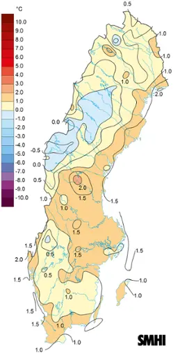 Månaden blev något varmare än normalt för landet, främst i östra Svealand, upp längs Norrlandskusten och i Tornedalen. I bland annat Jämtlandsfjällen blev det istället något kyligare än normalt.