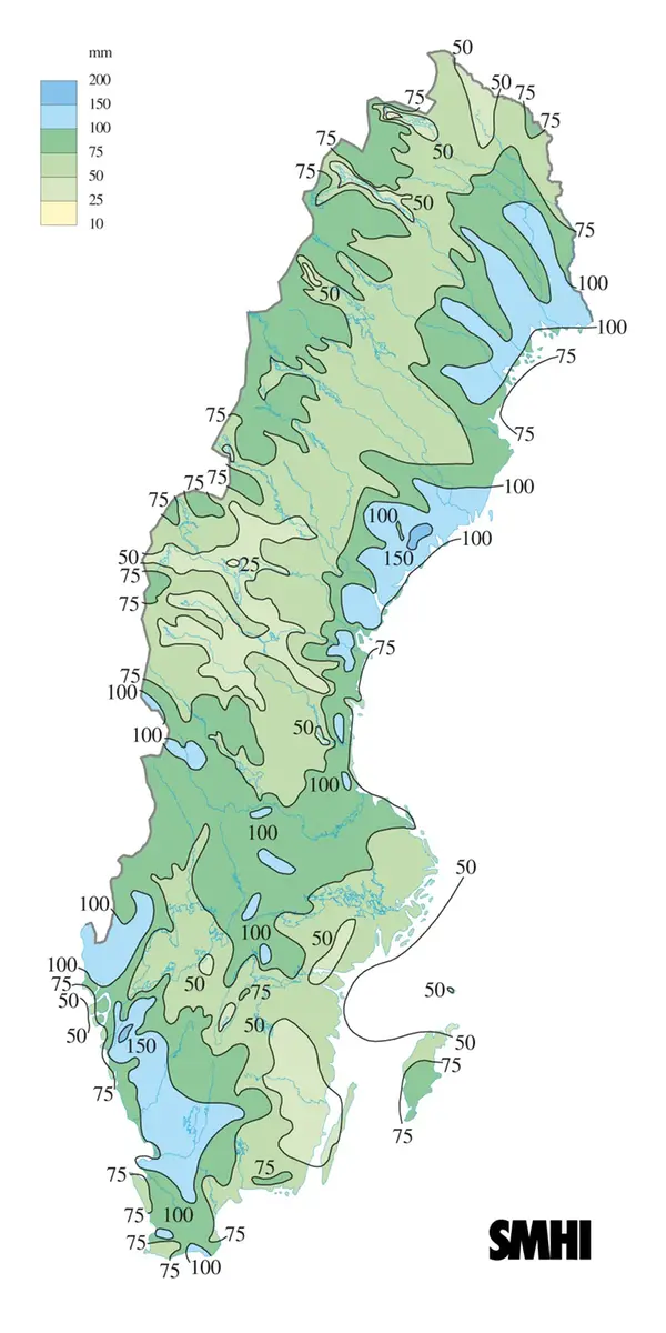 I delar av fjällen, delar av södra Norrland och i delar av Götaland har det istället fallit något mindre nederbörd än normalt.